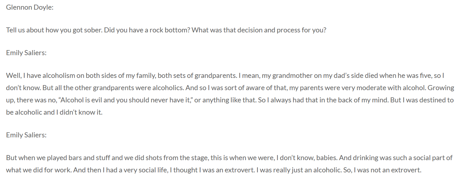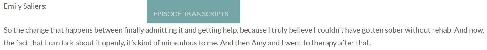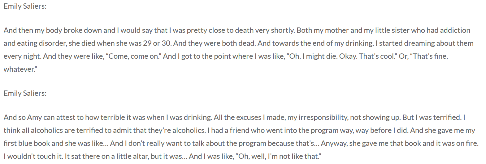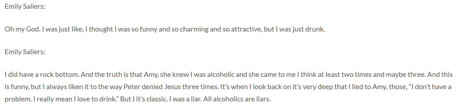 So that’s now. But to be sober, to wake up feeling good, to know that you’re not self-destructing, to know that you can be… Like now, I’m accountable to Amy, responsible to us, and to all the people and to my family. I never would’ve had my wife, she would’ve left me. She was going to, or my child and all the most beautiful things in life have come from sobriety.