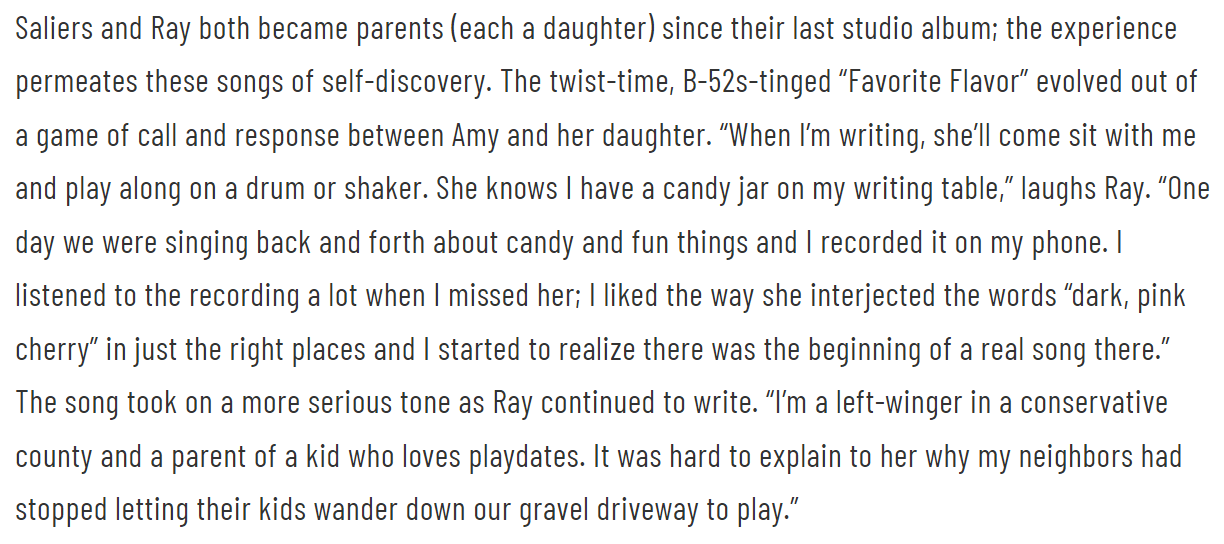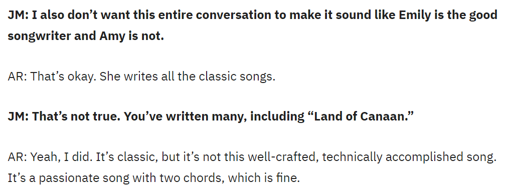 A lot of the time Amy is deferential to Emily's songwriting abilities. Even though, in my opinion, Amy's songwriting started very passionate. Has always been politically charged. And she really came into her own from Beauty Queen Sister on. You'll see that narrative of Emily being the more talented one being pushed throughout the documentary. So this post looks like I go hard in the other direction. The truth is I like both equally. Really! It just looks like I go hard for Emily and get defensive of Amy because I'm trying to counteract that very strong sentiment that the one is better in ways, which I don't think is true. They're just different.