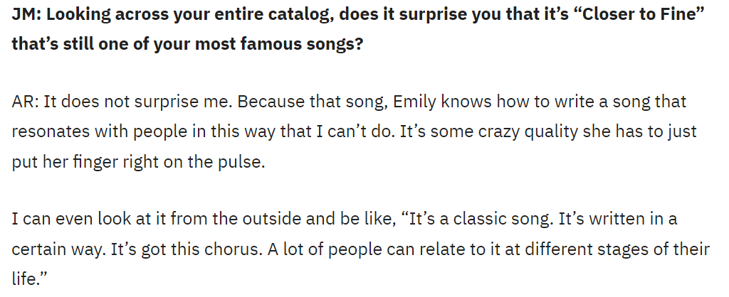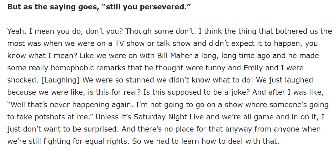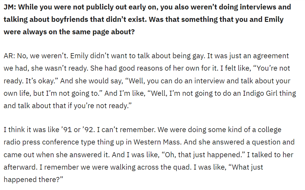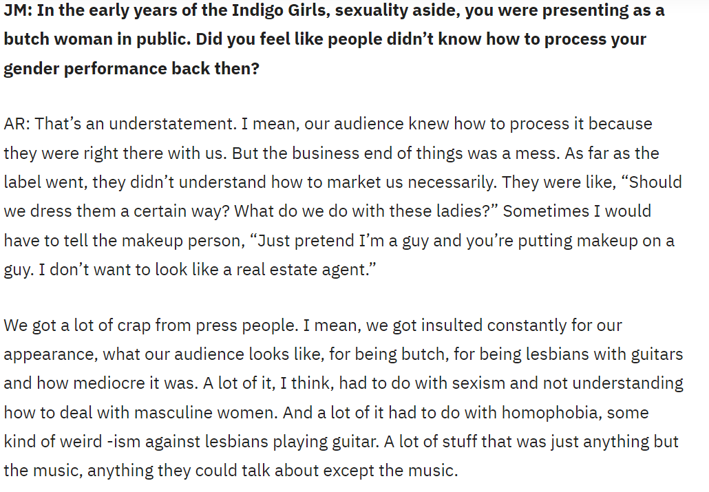 Emily talking about being physically and sexually attracted to men, but emotionally attraction to women. Ummm, wait, since when? Did she always feel this way and nobody clarified, or is this a new revelation? I guess at 60 she should know, but I sure as fuck didn't. Did we as media, society, or queers ever ask the gals what their specific sexualities were? Or have we just been assuming. This. Whole. Time? Or was it just me? And don't mind me, Amy and Emily can identify however they see fit, they can say one thing, do another, change their minds... It's not that--I'm just over here being disappointed that a full 50% of the lesbians I looked to in my own life have been cancelled (that's 2.5 people turning out to be terrible~ Ellen, my mentor, sometimes her ex-wife) and now I find out 40% of the lesbians (same group, 2 IRL) I looked to in my own coming out experience are not actually lesbians. It just changes MY worldview a bit. This is about me, not the Indigo Girls. Call me jarred.