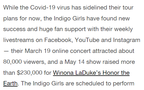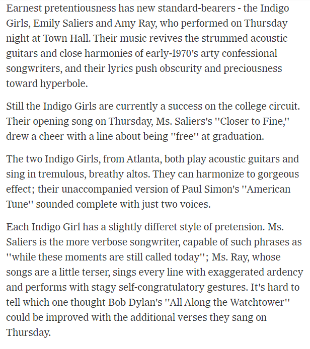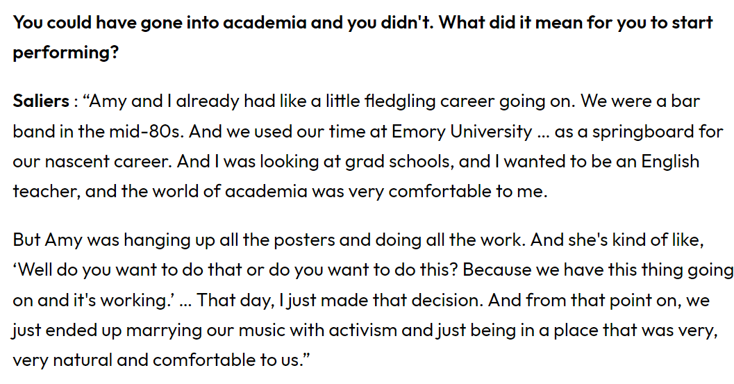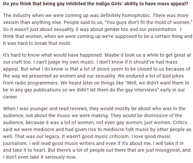Can I just say I am so excited the Indigo Girls are getting a bit of mainstream noise? It's so overdue. They've been long underappreciated, and under the radar. The duo should have been a commercial success the whole time, so I'm happy in this year 2024 they are still touring so they can enjoy a bit more visibility with the general public (us gays have always loved and honored them).